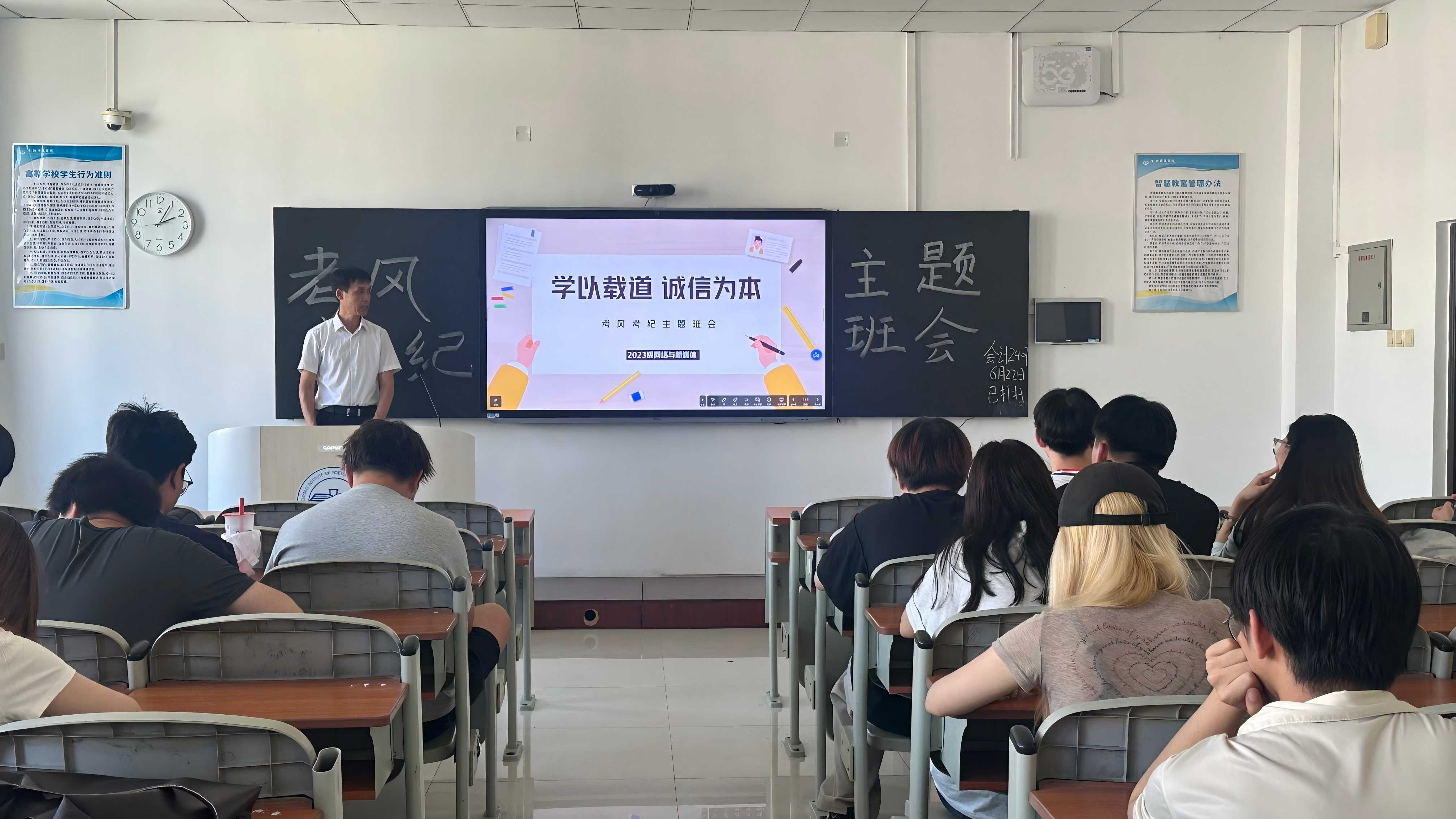 在班会中,赵老师围绕考试纪律要求、考场违规处理办法、诚信考试重要性等方面展开详细讲解。他首先强调,考试是检验学习成果的重要环节,每位同学都应自觉遵守考试规则,维护考试的严肃性和公正性。赵老师着重指出,考生须提前30分钟到达考场,按指定座位就座,严禁携带任何违规物品进入考场,手机等通讯设备必须关机并上交统一保管。同时,他结合以往考试违规处理案例,对抄袭、替考、传递答案等作弊行为的认定标准及处分措施进行了深入解读,严肃警示此类行为不仅会导致考试成绩无效,还将对个人学籍档案、评优评先等产生严重影响。