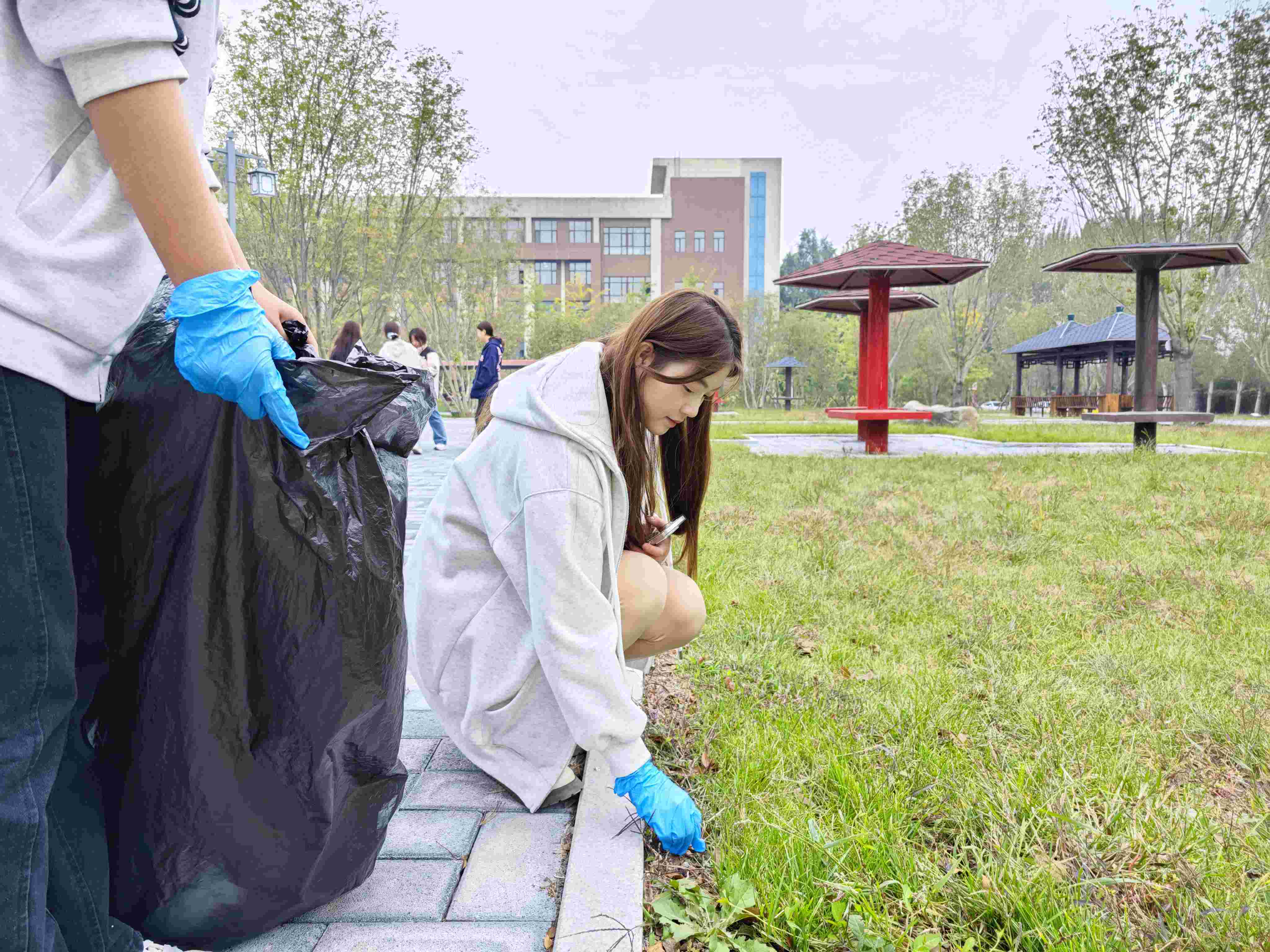 活动开展期间,同学们热情高涨、分工明确,化身校园“清洁卫士”,手持垃圾袋、夹子等工具,针对校园道路、草坪、教学楼周边等重点区域,有序开展清理工作。在主干道旁,同学们仔细夹起路边散落的塑料瓶、纸巾;绿化中,大家弯腰拨开枝叶,将隐藏在草丛里的烟头、食品包装袋一一拾起,哪怕是嵌在泥土里的小碎屑,也不放过。弯腰捡拾的身影成为校园里一道靓丽的风景线,同学们用实际行动践行环保理念,展现了人文学子的责任与担当。