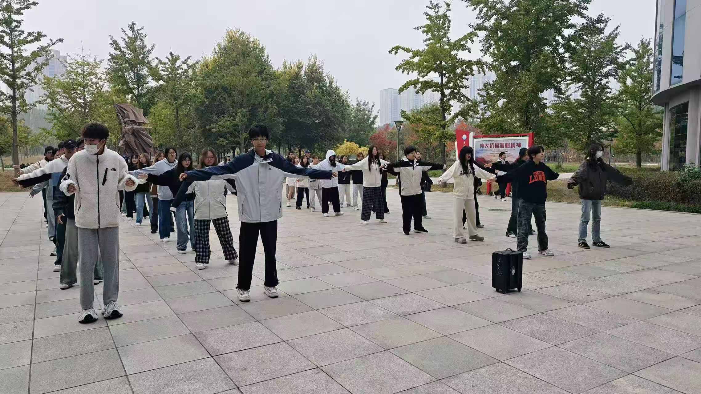 褪去睡眼惺忪,同学们迅速列队、整理着装,每一个动作都带着青涩却认真的态度。伸展、弯腰、转身、跳跃,广播体操的旋律在清晨的校园里回荡,红色的校服与雕塑的沉稳相映,成了校园里最鲜活的晨景。有人悄悄调整动作跟上节奏,有人轻声提醒身边同学“手臂再伸直些”,原本陌生的脸庞,在共同的动作里渐渐有了默契。