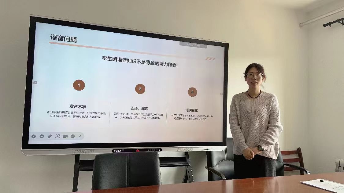 活动正式开始后,教研室主任率先开场,阐明本次教研活动的开展背景与核心目标,点明四级听力教学对于学生英语能力提升、考试通关的重要意义,随后,本次经验分享正式进入核心环节,由张颖老师立足多年一线教学与四级备考指导经验,开展全方位、深层次的教学分享。