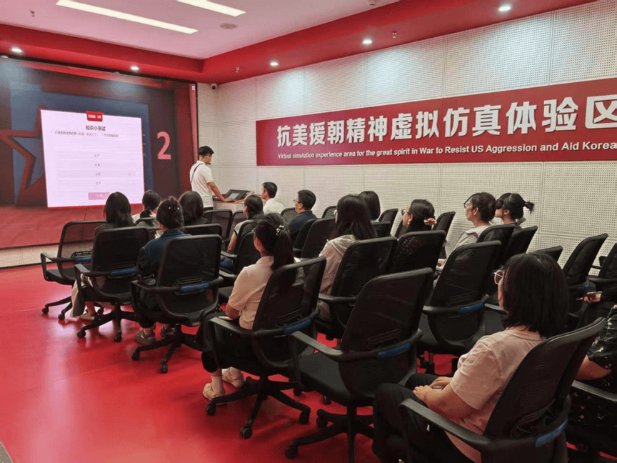 随后,教师们移步至抗美援朝精神虚拟仿真体验区,通过多媒体和交互技术深入学习了相关历史知识,并积极参与现场知识问答。大家踊跃答题,在巩固历史认知的同时,也进一步增强了对爱国主义和革命英雄主义的情感认同。